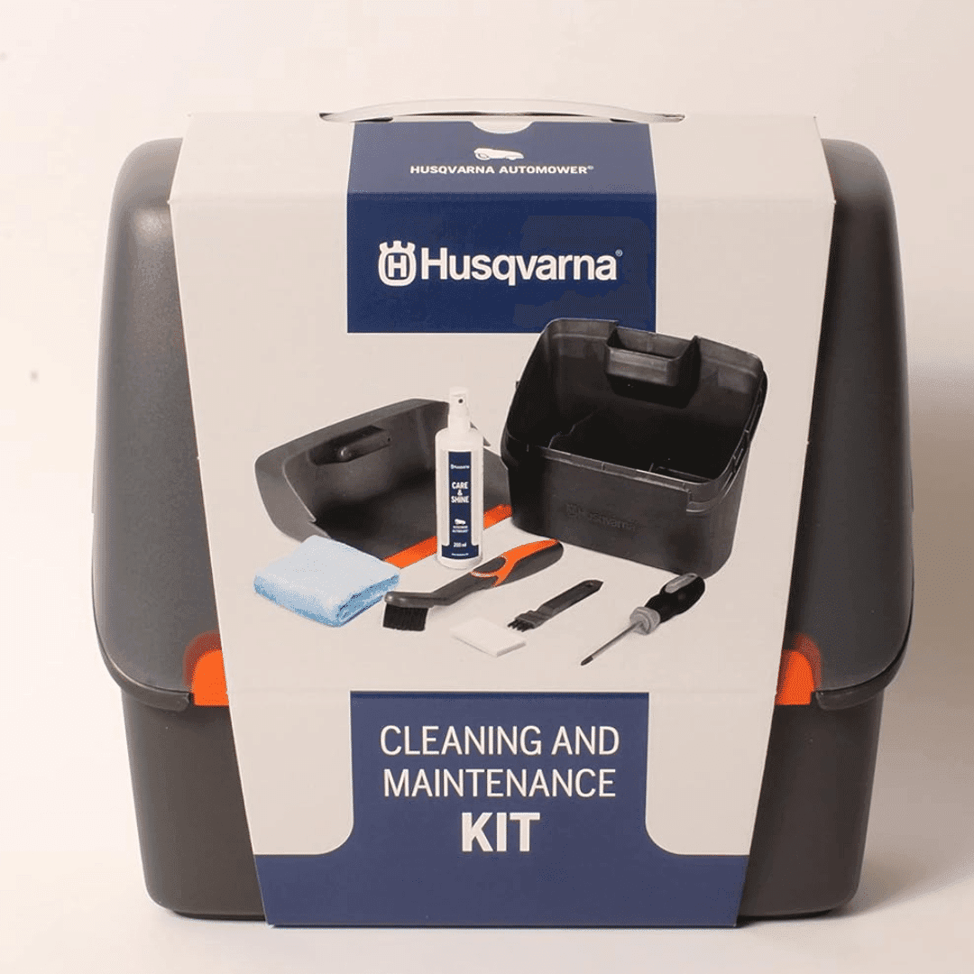 Equipment for lighter cleaning and maintenance of the Automower during season. Contents: Two special brushes, one with very slim and steep shape and second small brush with scraper for removing grass and dirt. One screwdriver for changing cutting blades. One abbrasive pad to clean the connectors on mower and charging station. One towel and one bottle of plastic care spray to make plastic parts shiny.