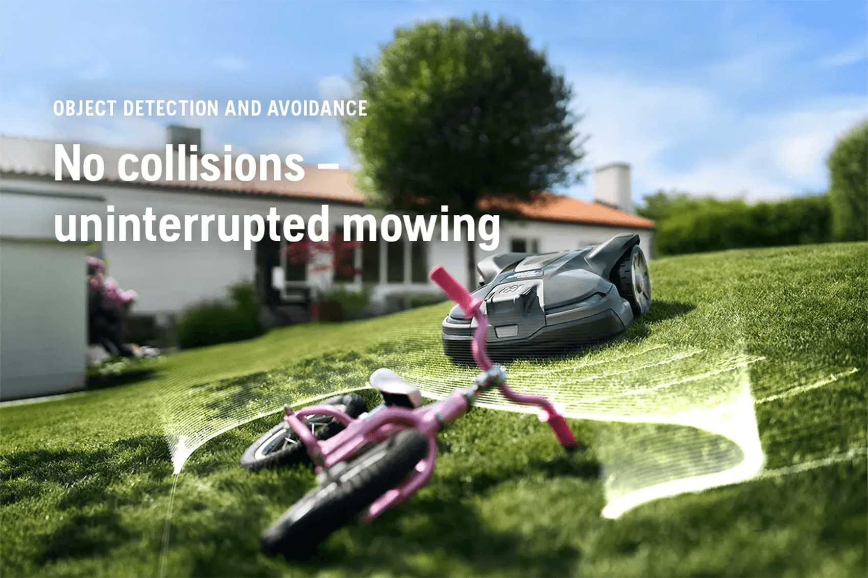 Built-in technology assists the mower to detect and avoid objects, reducing the risk of unplanned stops. The detections mode reduces the speed and makes collisions softer and the avoidance mode causes the mower to turn away and avoid impact.